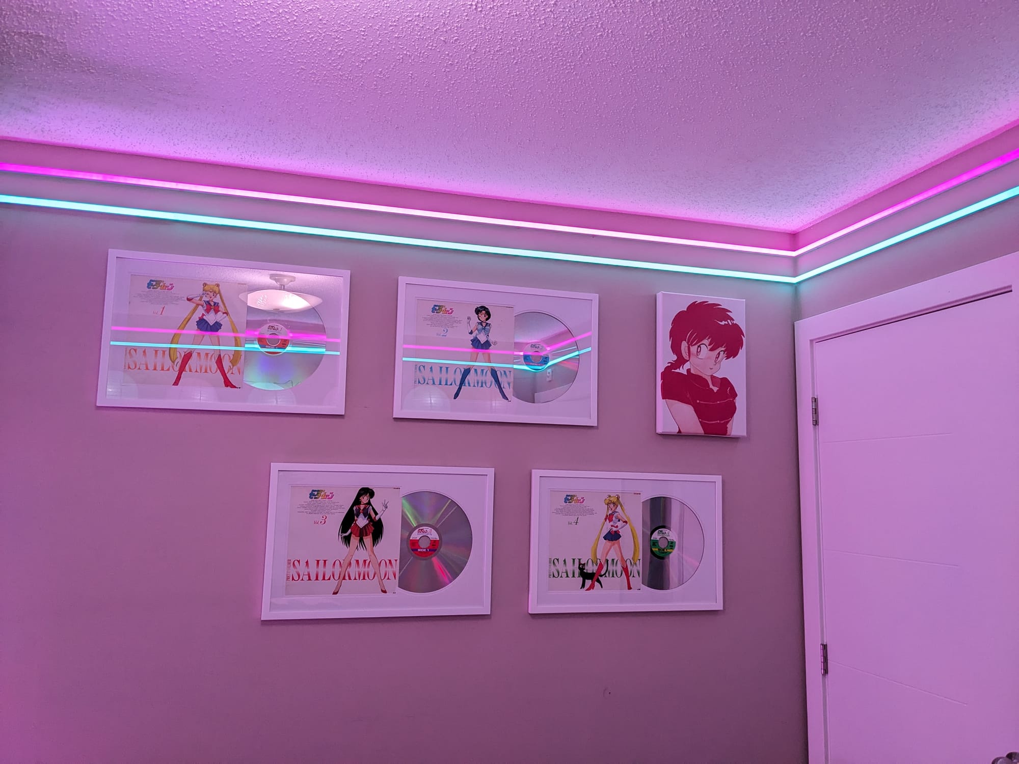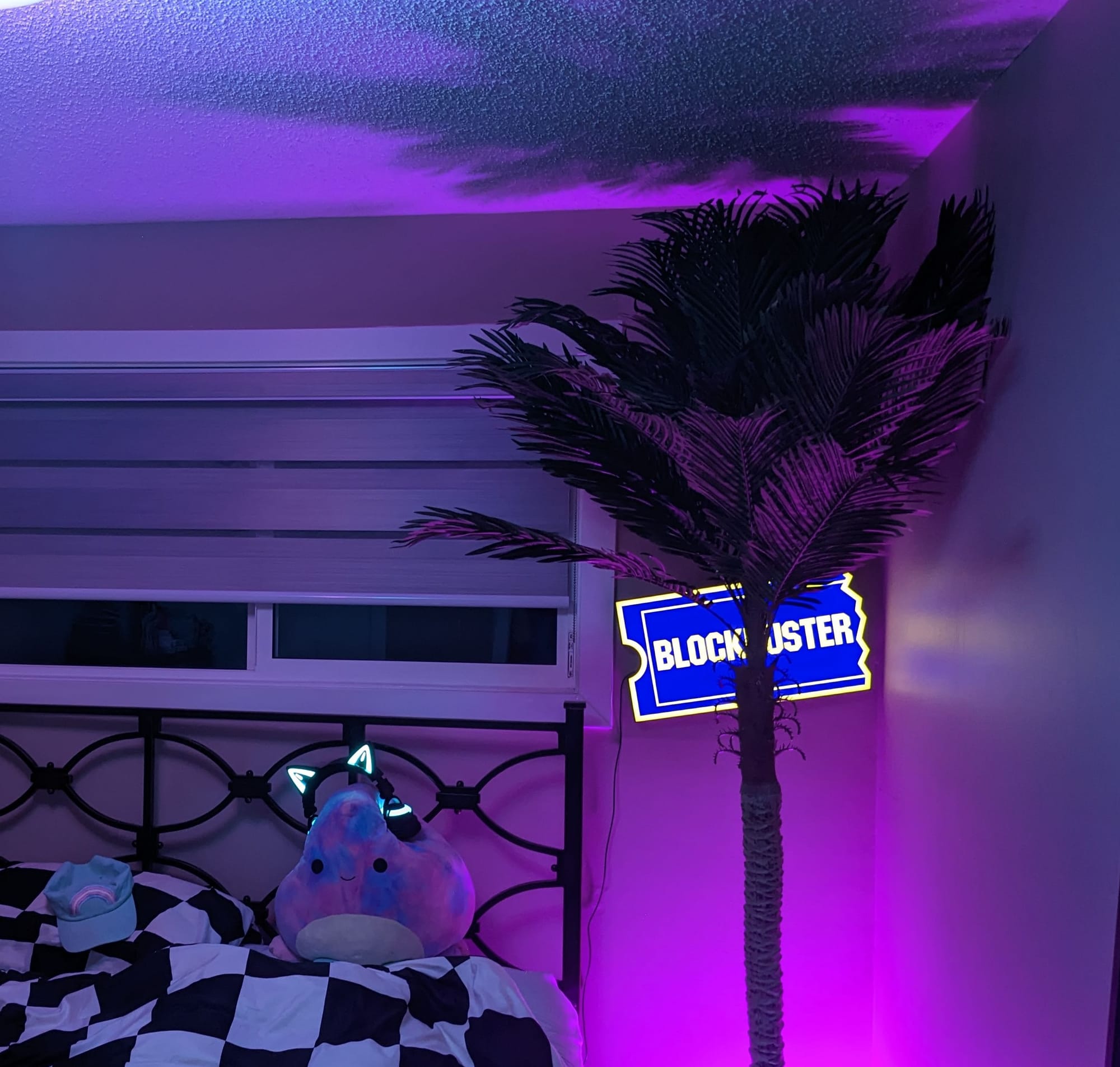 As an electronics nerd and sometimes musician, I decided one of my household projects would be to decorate a bedroom with a mallsoft/vaporwave look. To those unfamiliar, this subgenre aesthetic hearkens back to the heyday of mall culture in the late 1980s to early 1990s complete with neon lights, (fake) palm trees, washed out colour palettes, checkerboard tiles, escalators, gaudy fountains and statues, and nostalgic reminders of the corporate franchises of yesteryear.