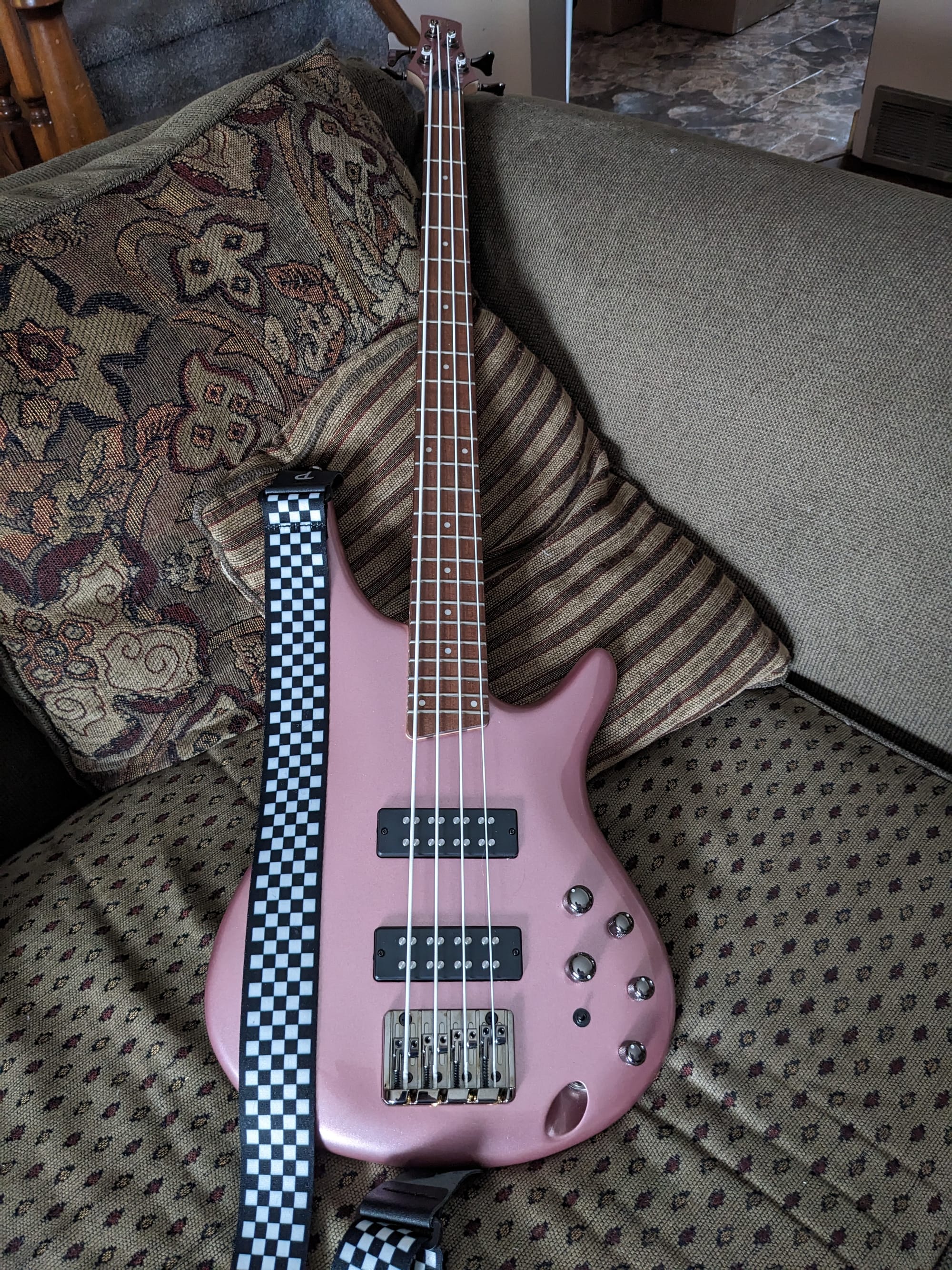 While continuing to plan and waiting on all the supplies, I started getting the decor in order. I acquired some checkerboard bedsheets, an appropriate alarm clock, an 8-foot tall silk palm tree, a re-creation Blockbuster Video sign, and an element not found in the original plan: an Ibanez SR300E bass guitar in Metallic Pink, which I promptly put a checkerboard strap and bright white strings on.