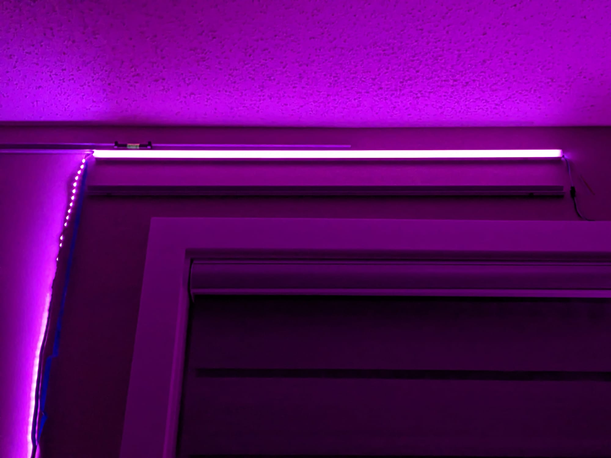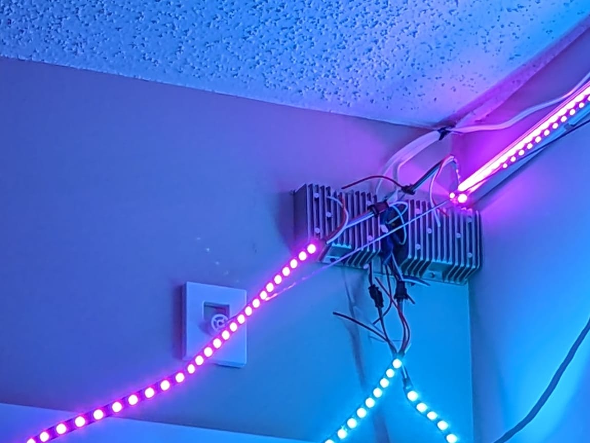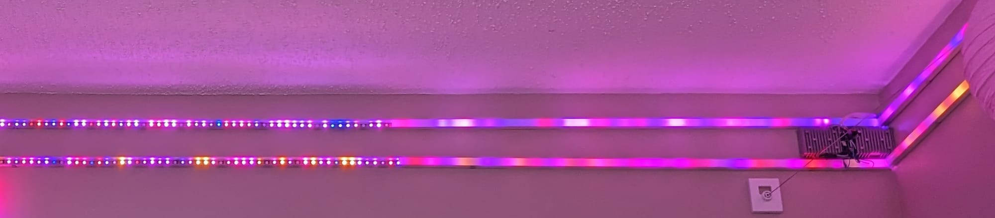 I finally bit the bullet and bought 12v, ws2815 LED strips in August 2023. Down came the buck converters and 5v strips I had put up so far, up went the 12v strips. I kept the ATX power supply and 12v injection point I had wired to the corner of the room, but it looked a lot less unsightly without the buck converters. I could finally be excited about the project again and in short time I had it completed.