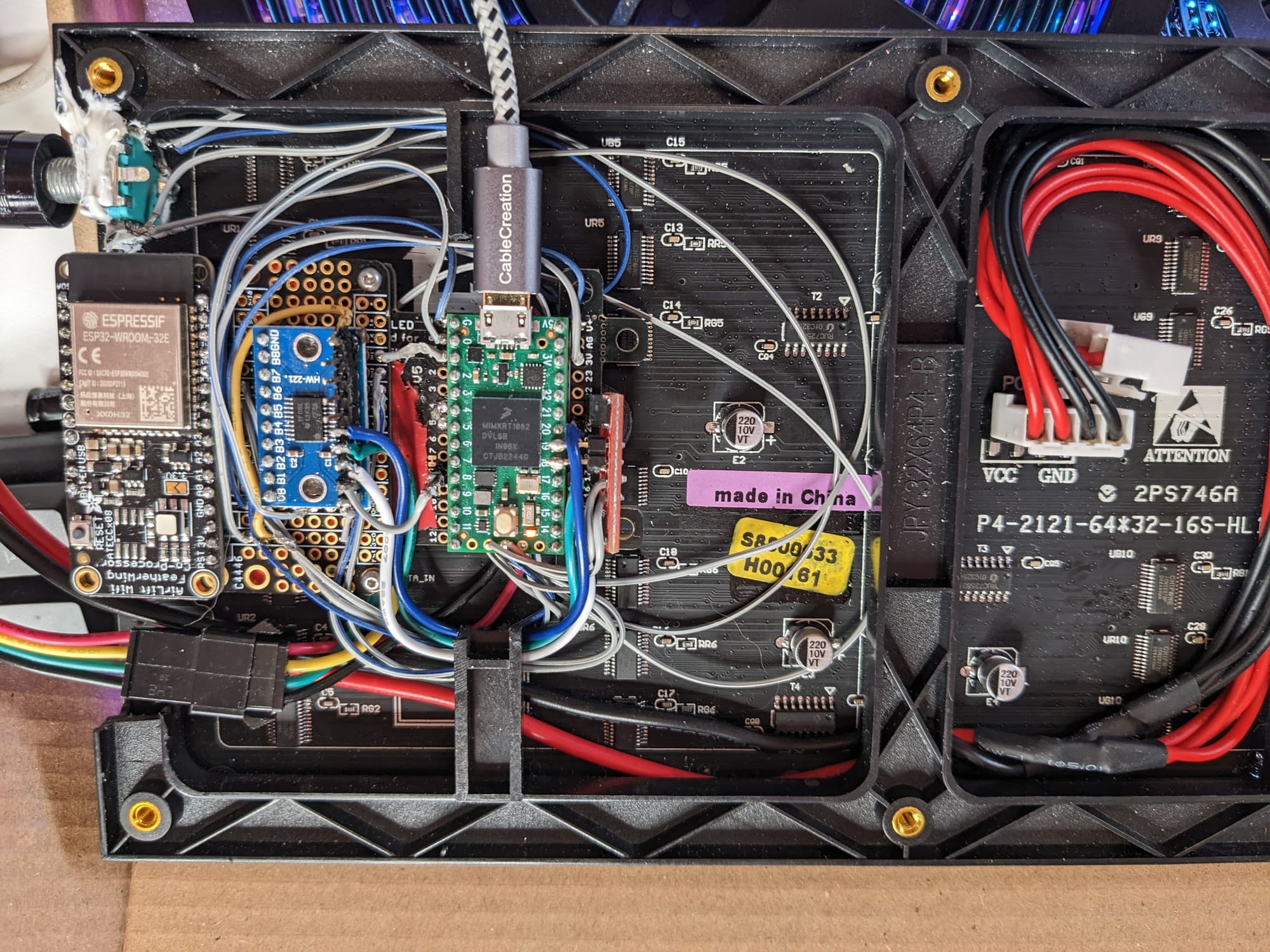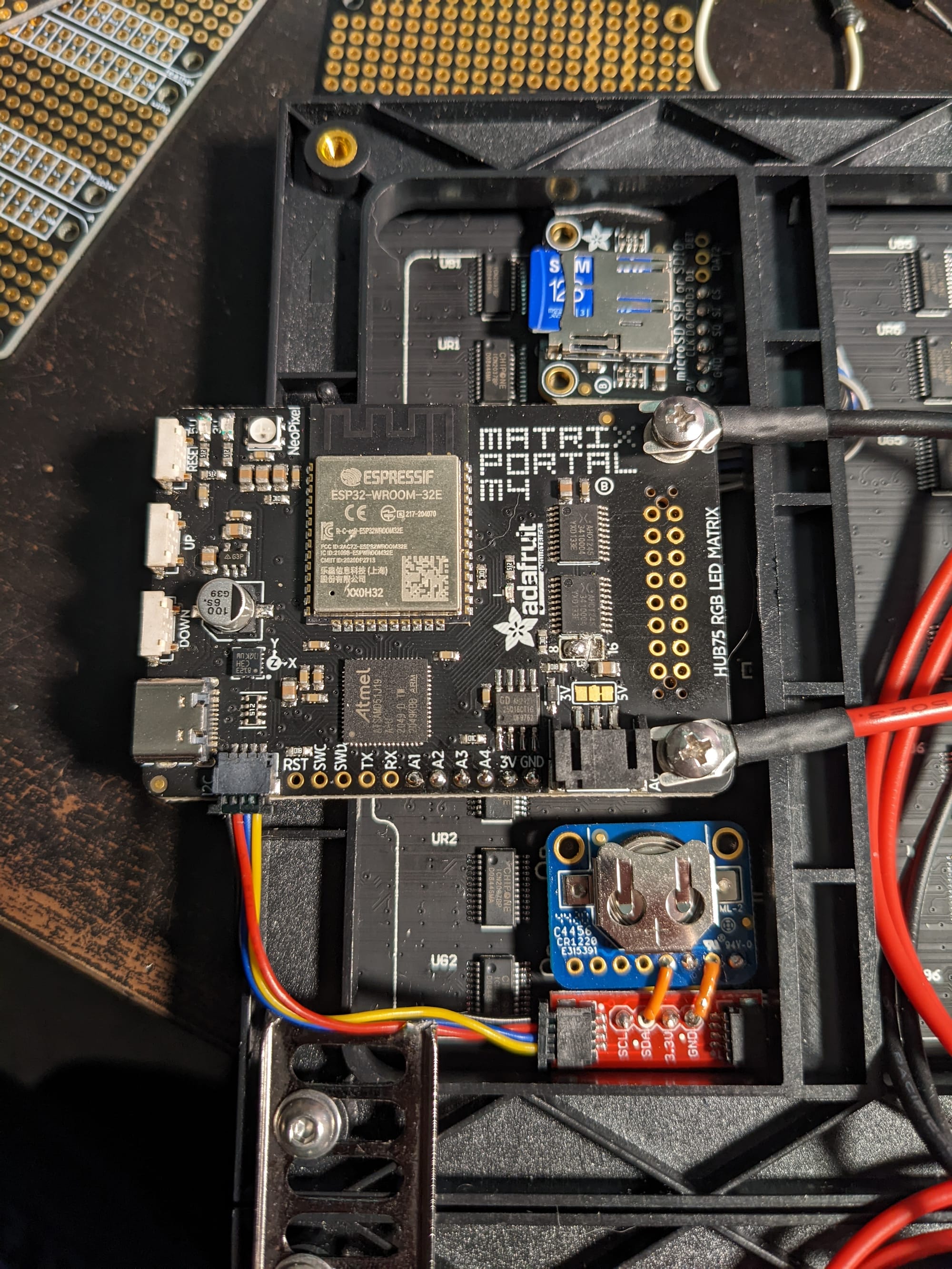 Around April 2023 I discovered the power of the Teensy 4.0 and 4.1 development boards as well as the SmartMatrix Shield for Teensy, allowing it to control a HUB75 matrix display (see, I told you we'd get back to the matrix displays!). By May I had put together a first iteration using a Teensy 4.0, a level shifter board, and an Airlift Featherwing (for Wifi).