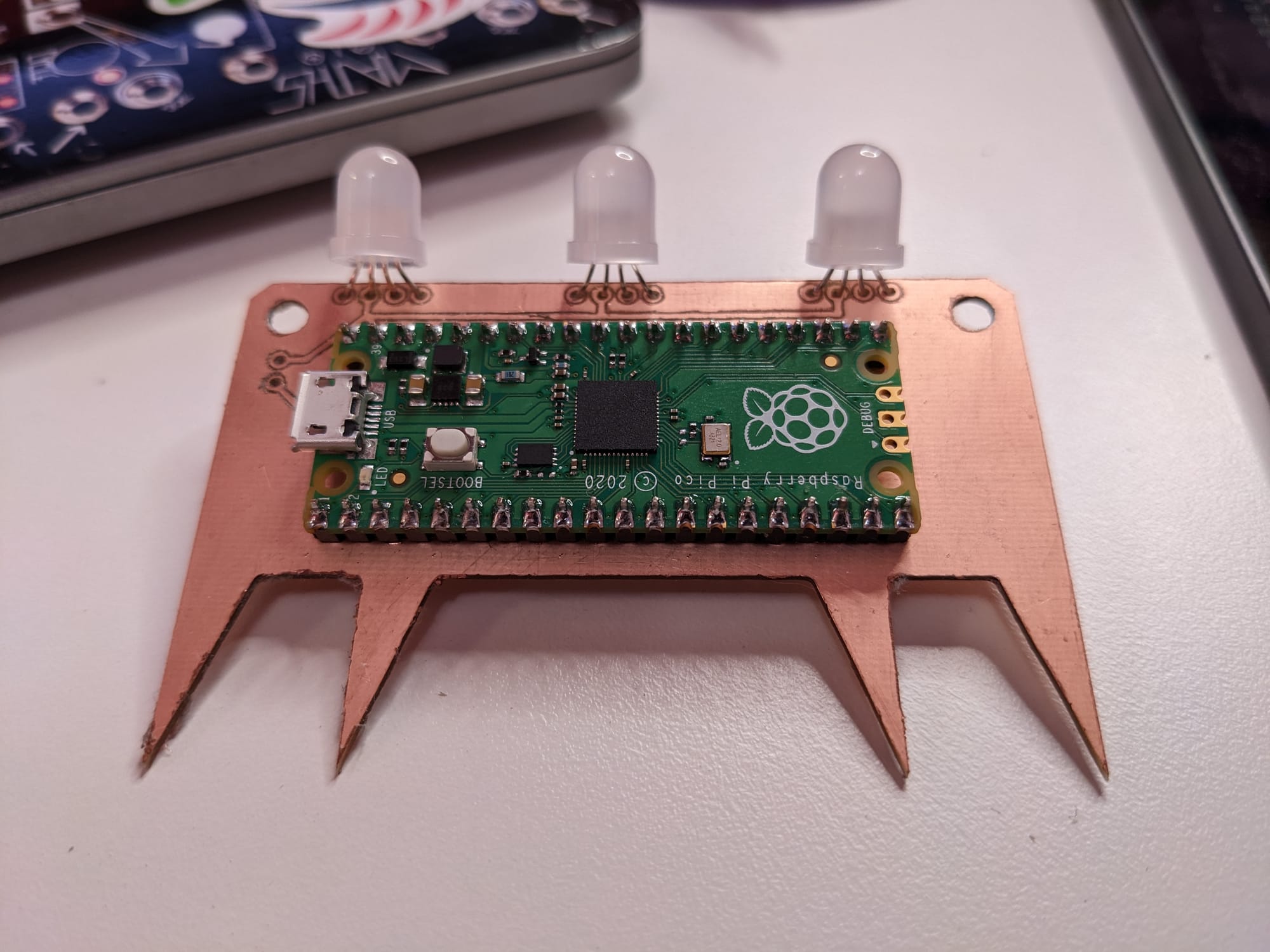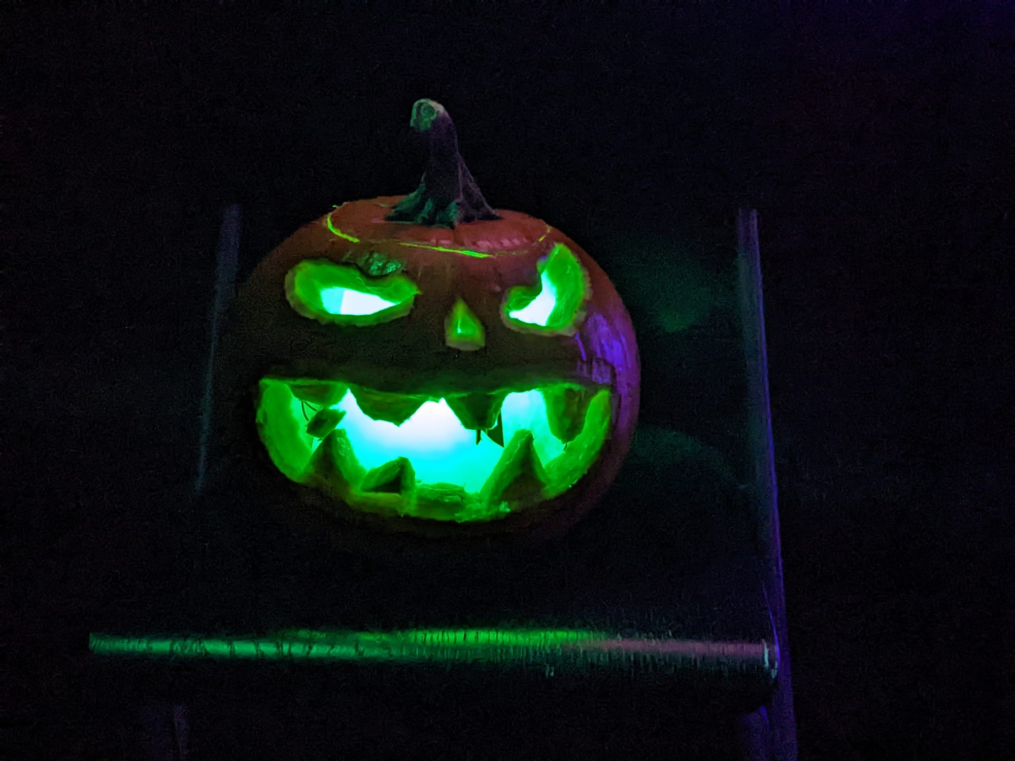 I'll come back to the matrix displays in a bit. Suffice to say, this piqued my interest in addressable LEDs and I started to think about what came next. By October 2022, I decided I needed a way to cleverly light up a Jack-o'-Lantern and I designed and milled my first individually addressable LED project, the Pumpkinator, a Raspberry Pi Pico-based device that flickers multiple addressable LEDs to look somewhat like an off-colour candle flame. I used Adafruit's Diffused 8mm Through-Hole Neopixels as the light source.