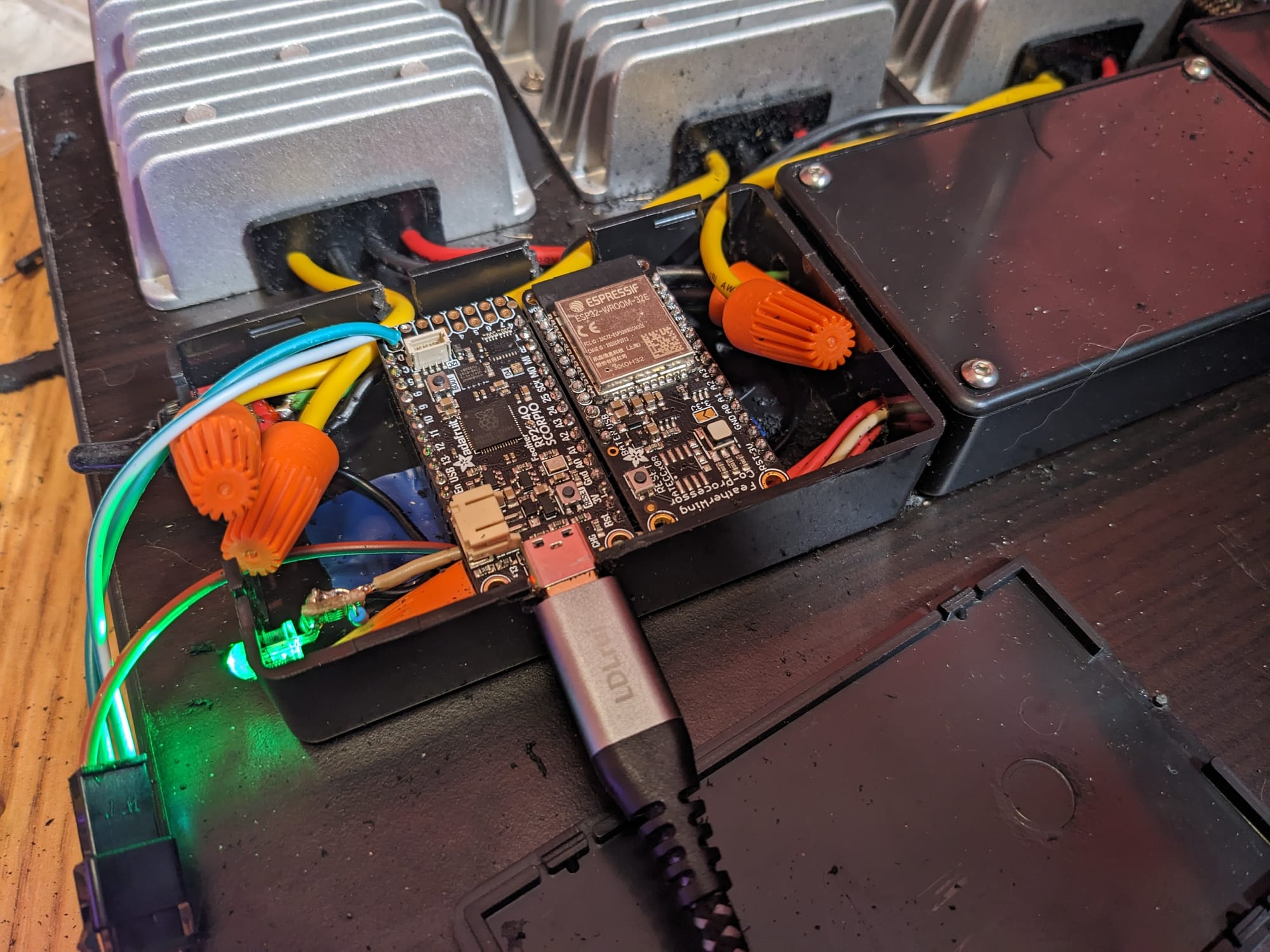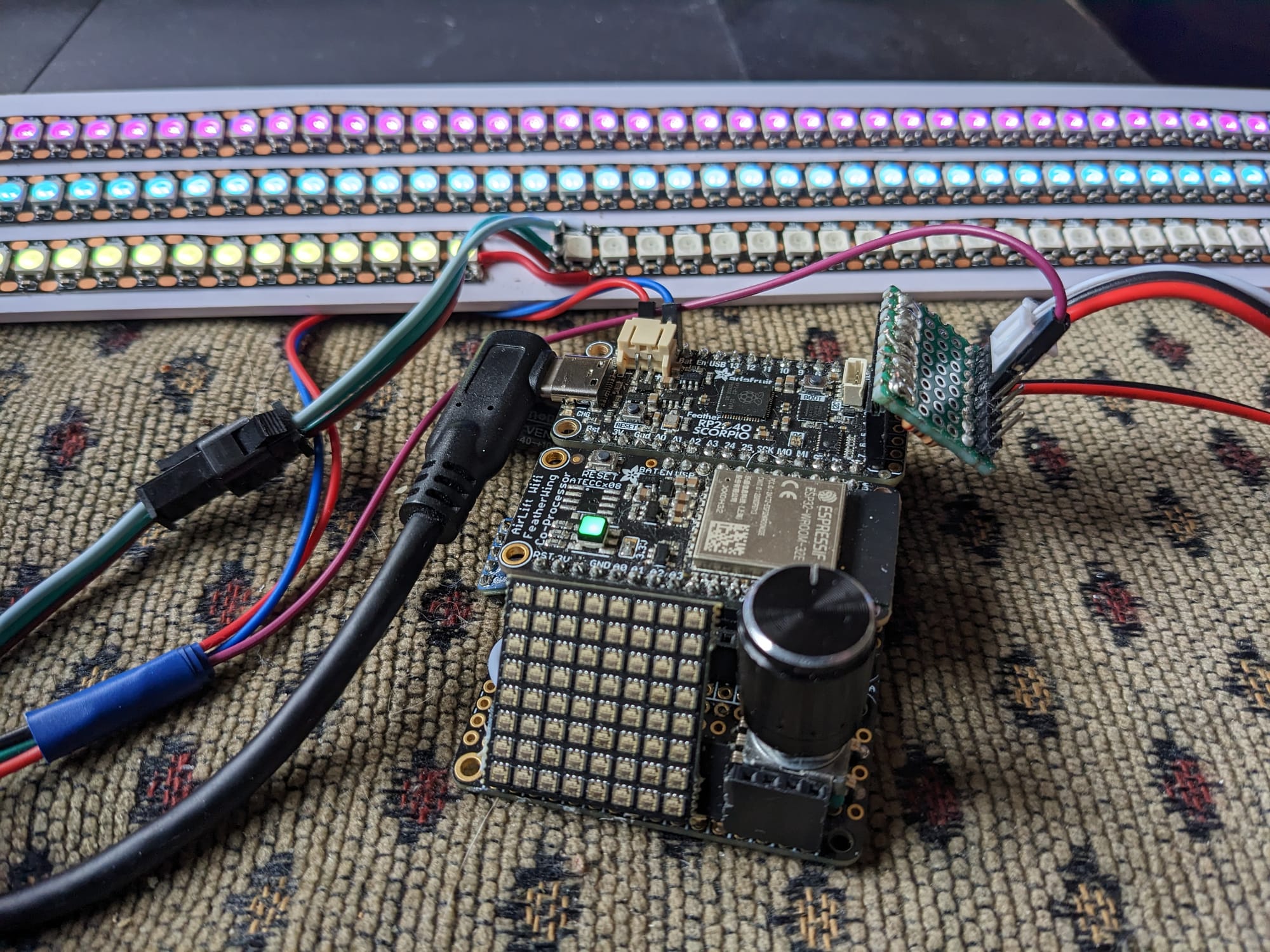 In late 2022 I stocked up on more Adafruit supplies, including the new RP2040 SCORPIO board. This board had the same brains as the aforementioned Raspberry Pi Pico, but it also had 8 5v level-shifted outputs to use for controlling large numbers of LEDs. I combined that controller with an Adafruit Airlift Featherwing to give it WiFi support and whipped up some code in PlatformIO (with Arduino libraries) to breathe life into the >1500 LEDs.