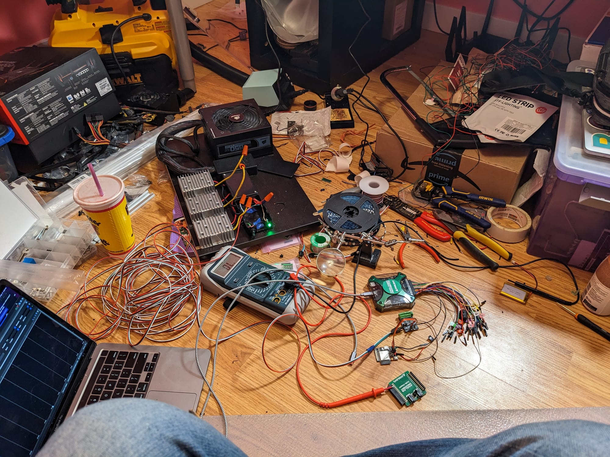 In February 2023 I got my hands on an Electromage PixelBlaze and v3 Output Expander. The PixelBlaze is an independently-developed ESP32-based LED controller with a classy web interface for control. I bought this because it had a load of readily usable patterns I could immediately use with the LED strips and I could easily develop my own patterns.