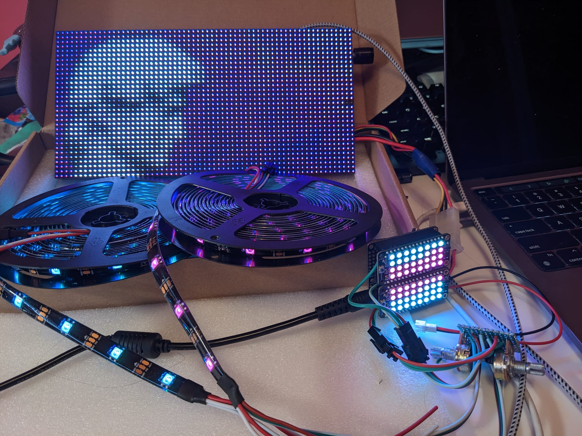 I attached a Real Time Clock and sensors to the display to make it more useful on the bedside table, and mapped out the framebuffers to show a clock and mini scene of the bedroom with active LED patterns echoed on the front.